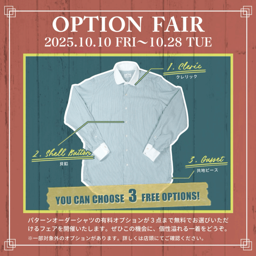 パターンオーダーシャツの有料オプションが「3点」まで無料でお選びいただけます。